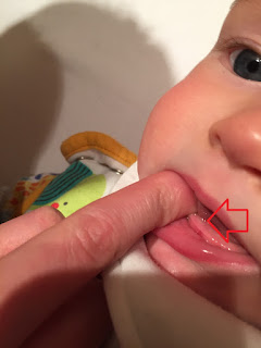 Well, to be honest he has one tiny little white lump at the front of his gum that’s barely visible….but there is some evidence in his bright red cheeks and the noises he’s making.